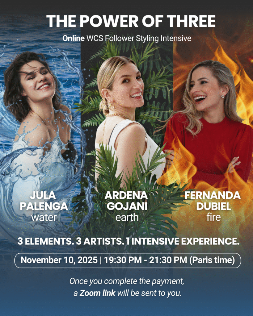 Discover the artistry of follower styling in West Coast Swing through the lens of the four classical elements — Water, Air, and Fire. In this intimate 2-hour session, three world-class stylists will guide you to unlock deeper expression, dynamic contrast, and fluid musicality through their distinct elemental approaches: